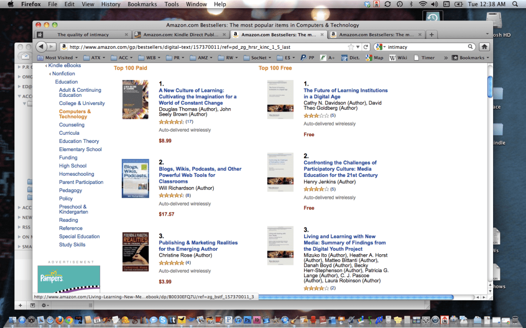 As for Publishing & Marketing Realities for the Emerging Author, I added this eBook on the Free eBooks site without a grand announcement, just to see if anyone would find it. And a few did. When telling people about the book, I also told them that if they didn’t want to pay for it, they could get it off my blog for free. Only 13 people downloaded it for free, but on Amazon it has reached #14 in Authorship books and #3 in Computers & Technology Education books!
