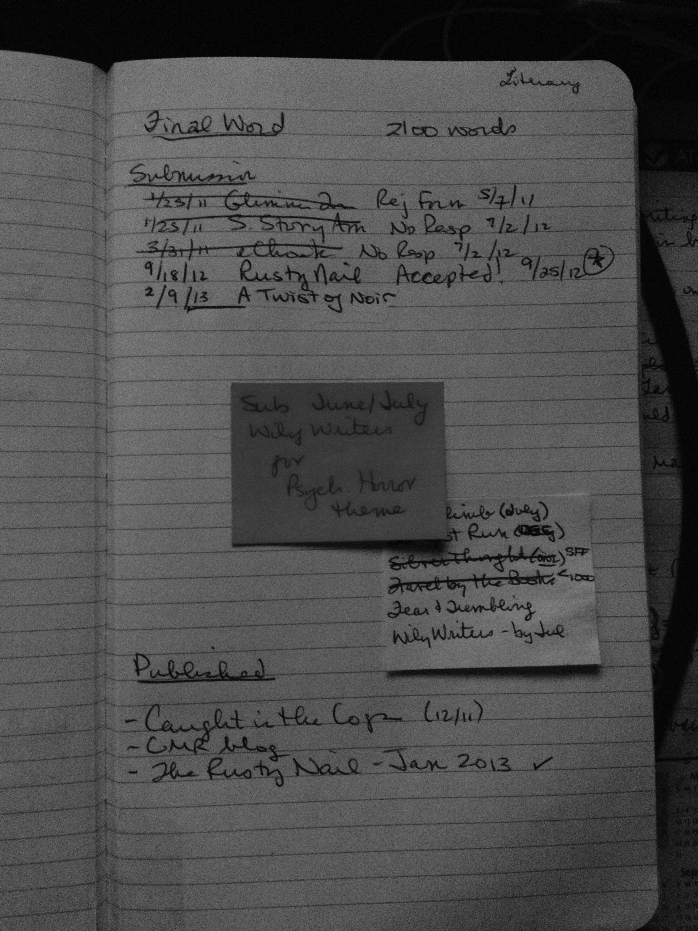 Remember, this journal is for your benefit. It doesn’t replace the Duotrope submission tracker. It works along with it. This way you can have quick reference to which stories are out and which need to go out. After all, once you have a dozen short stories, that submission tracker can get very confusing. In fact, I filter my submission tracker to only show my accepted stories and those awaiting response. Anything rejected gets hidden for the sake of my sanity, not for my ego. This way the submission tracker is streamlined and manageable. I see all my rejections in my notebook, so as not to submit to the same market twice.