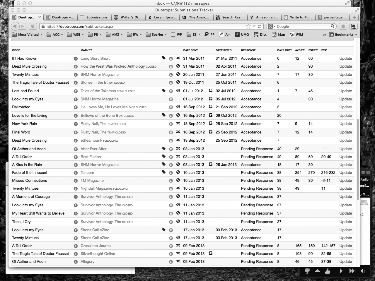 Your submission tracker (above) shows what story you submitted where and when. It also has symbols that indicate whether or not the market accepts simultaneous submissions or not. The numbers on the right are, from left to right, the number of days out, average days to respond for that market, maximum response time for that market, and the number of days when you should expect a response. If that last number goes into the negatives, it’s time to query about your story, or in extreme cases, like if it’s been over six months, withdraw it.