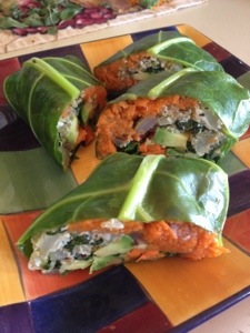 One of the things I’m doing is cutting way way way back on wheat, sugar, and dairy, as well as eating more leafy green vegetables. I went kinda crazy with the fresh fruit, veggies, and leafy veggies the first time out (left), so when the greens started wilting the following day, I scrambled to find recipes in which I could use them up quickly! This made for a lot of YUMMY green smoothies (bonus recipe at the bottom of this post for a particularly yummy one) and other new ways of eating. My favorite so far is making wraps with Collard Greens. The original recipe I altered is from The Whole Life Nutrition Cookbook and website: Collard Wraps and Raw Sunflower Seed Pate. I foolishly didn’t buy raw sunflowers, so I only have roasted (complete with the likely rancid oils therein), but I made do anyway. They had to soak overnight and I wanted to do something straight away, so I decided on Sweet Potatoes. One of my favorites, especially in the Autumn and Winter. Here’s what I came up with:
