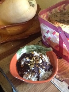 I broke the smoothie fast with a smoothie! (and two pieces of celery slathered in sunflower seed butter). About 90 minutes later I had a nice bowl of brown rice covered in blueberry syrup and toasted pumpkin seeds. It was heavenly, although I nearly burned my house down toasting the pumpkin seeds (slight exaggeration). Just FYI, don’t toast shelled pumpkin seeds in a toaster over on the “toast” setting. They do catch on fire. However, toasting them at 300F for 10 minutes was perfection. In a celebration of the coming autumn, my favorite time of year, I even enjoyed it in a pumpkin bowl.