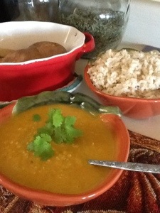 Makes about 4-5 cups of soup, or three 1 1/2c servings. The below nutritional information is per serving with 1/4c cooked quinoa, but you could also use brown rice.