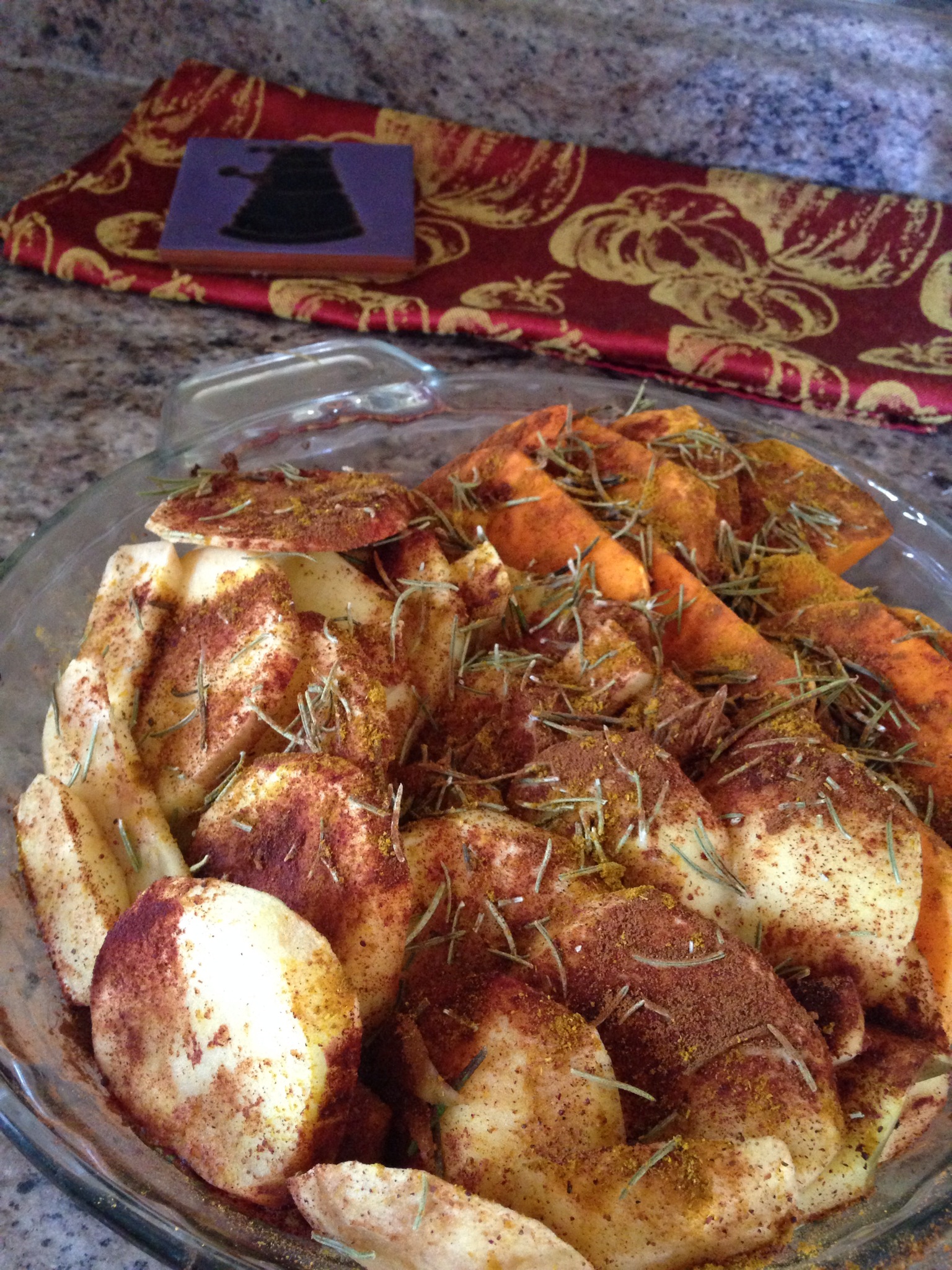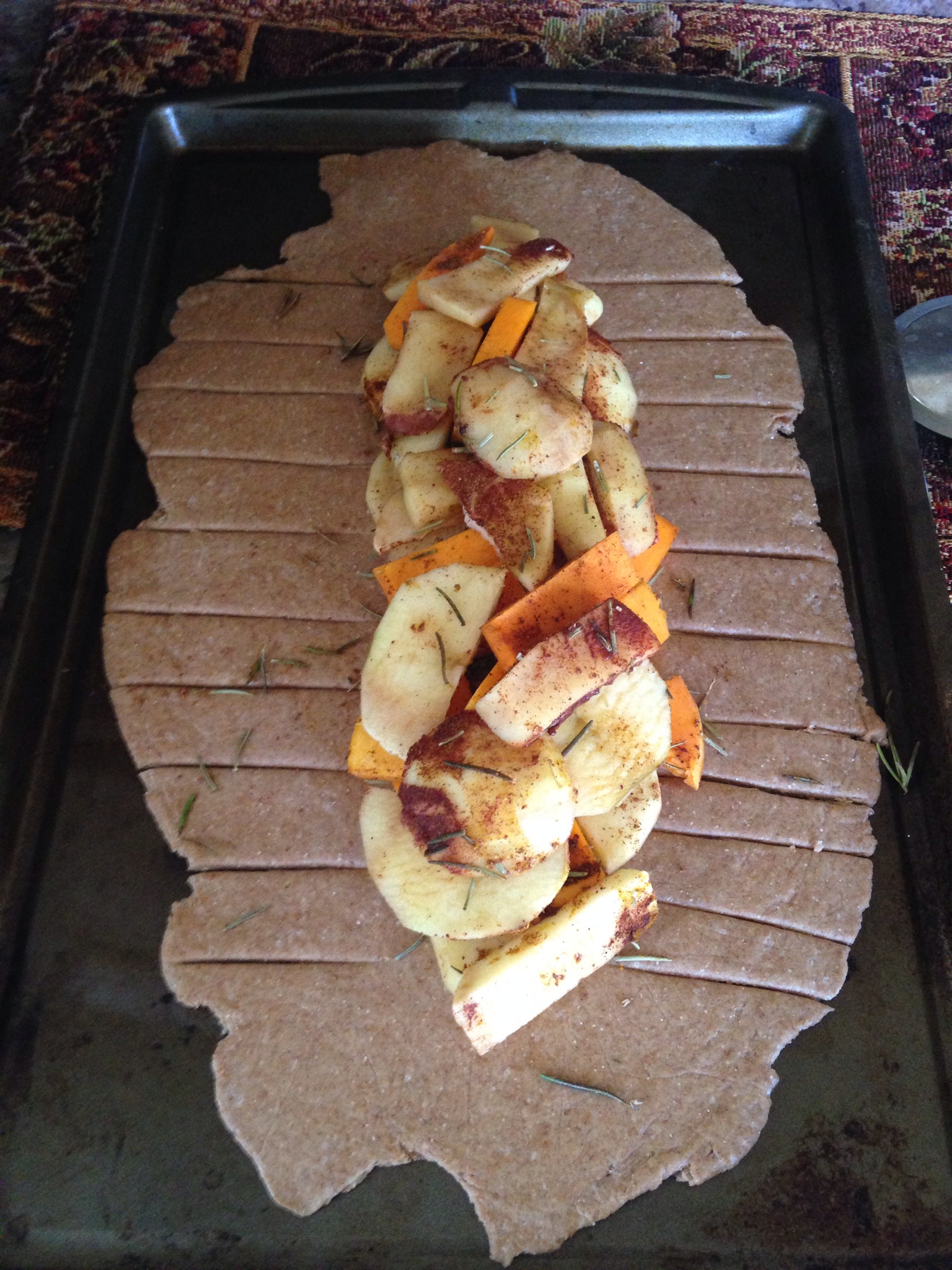 First I baked the thinly-sliced apple and butternut squash (coated in cinnamon, nutmeg, and curry) in a 350° oven for 15 minutes. While that baked, I mixed the dough with only 1/2 the sugar (and low glycemic coconut sugar at that), then rolled it out, which took some muscle! Good thing I’ve been working out!