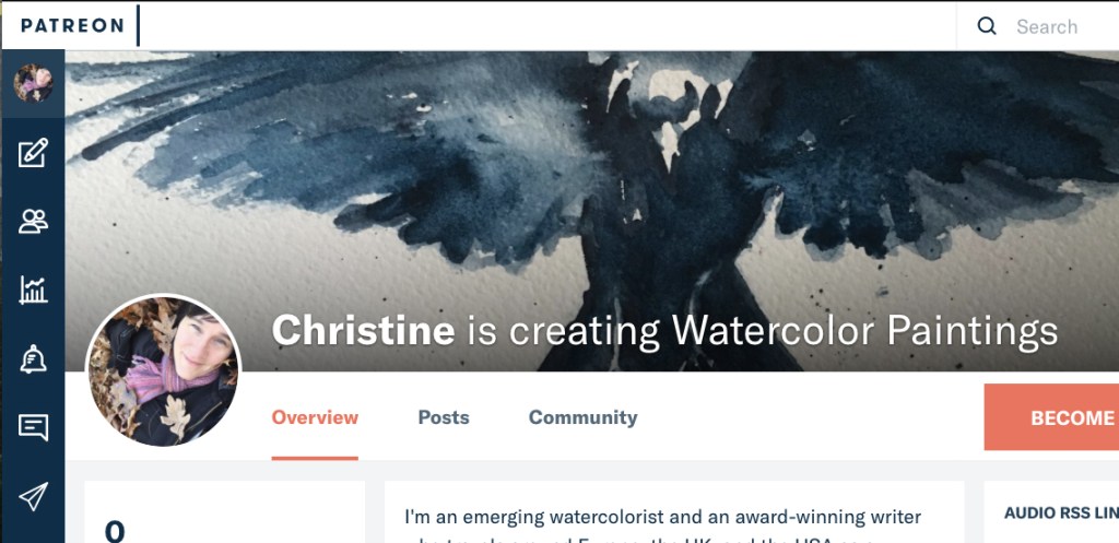After many people suggested this site to me, I finally got it going today. Patreon is a wonderful site that enables you to support artists in the traditional way. Through monthly pledges, starting at $1/mo, you can patronize an artists and get cool rewards for doing so. This one focuses on my watercolor work, but for fans of my writing, I’m in the planning stages of writing my first play as well.