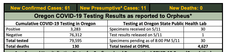 I woke up this morning relatively rested, but soon thereafter heard the news that the USA and UK are going to beat COVID-19 by just not reporting the numbers. They’re getting too high, and that doesn’t fit with their plans to re-open the country. First, the numbers we have (nearly 1.5m in the USA and over 80k dead) aren’t accurate because we still don’t have adequate testing. Over two months in, and they’re still not testing more than 200k people nationwide. They were only testing 40 people a day in all of Oregon, and now there seems to be conflicting data on the OHA website. This page says the capacity to test 3,150 a day, but this page shows only 30 tests were delivered on May 11, 2020 with only 1 result released. I don’t understand.