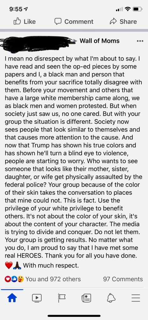 Of course, that is part of the problem. It took the feds shooting one young white man with a less-lethal round, causing a skull fracture and brain damage, for the movement to regain momentum. The scores of Black people murdered by police apparently hasn’t been enough for the media to care for more than a few news cycles. It took a wall of mostly white moms locking arms to gain national attention, even though Black moms have been grieving the loss of their children at the hands of police violence for decades (nay, centuries).