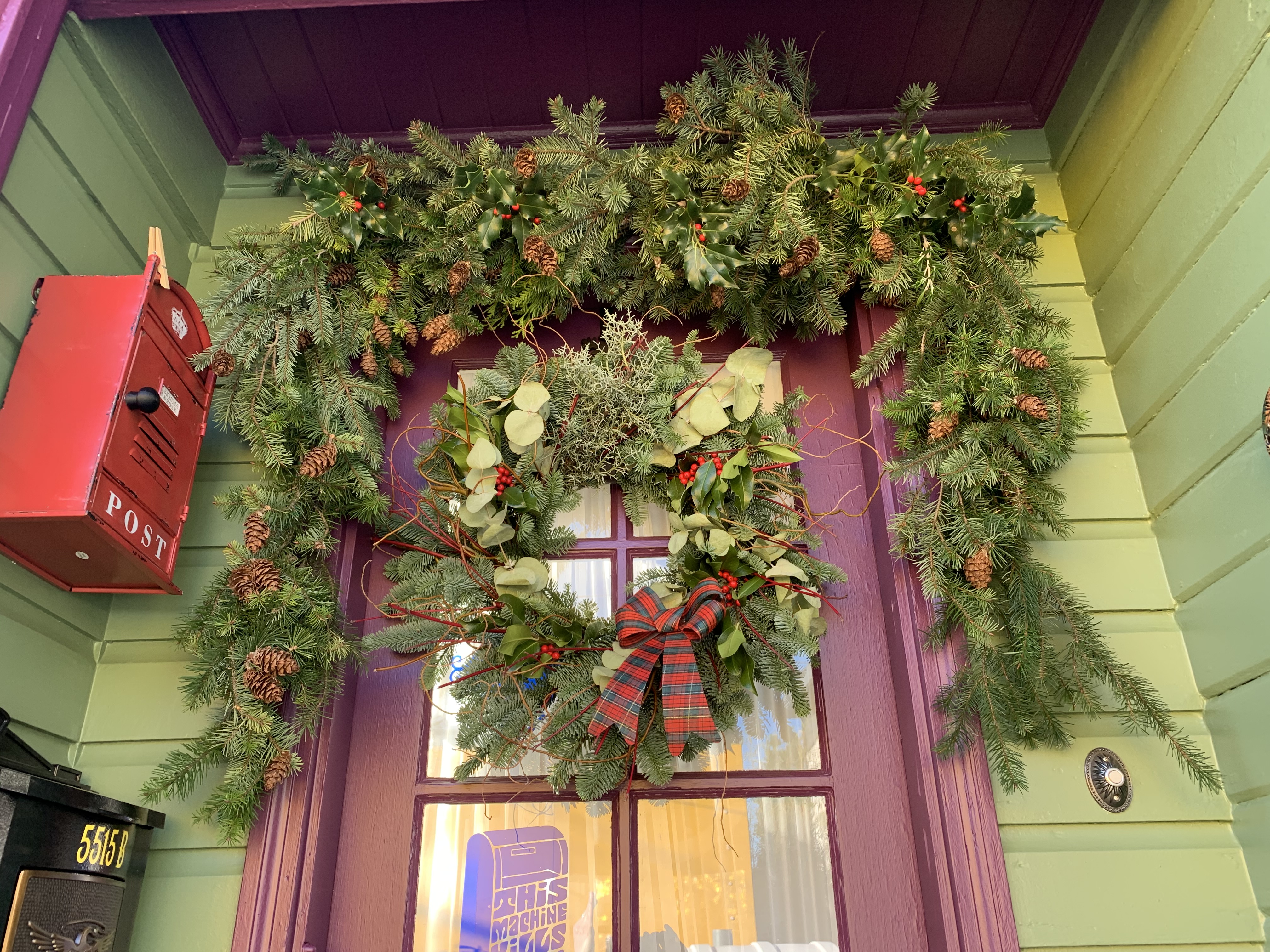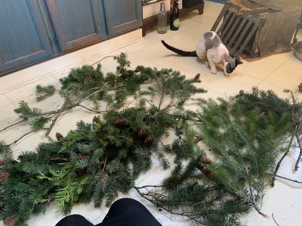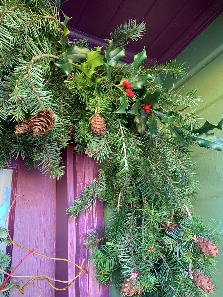I started with outdoor lights, a beautiful wreath, and a homemade garland. I couldn’t find a nice, full garland for over the door, so one day on a walk, I noticed so many discarded boughs along the road. I started collecting them, and before long, I had enough to made this beautiful garland: