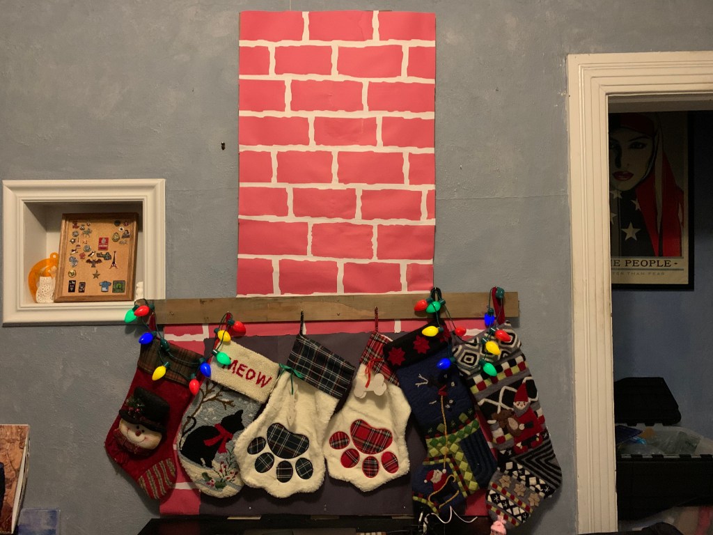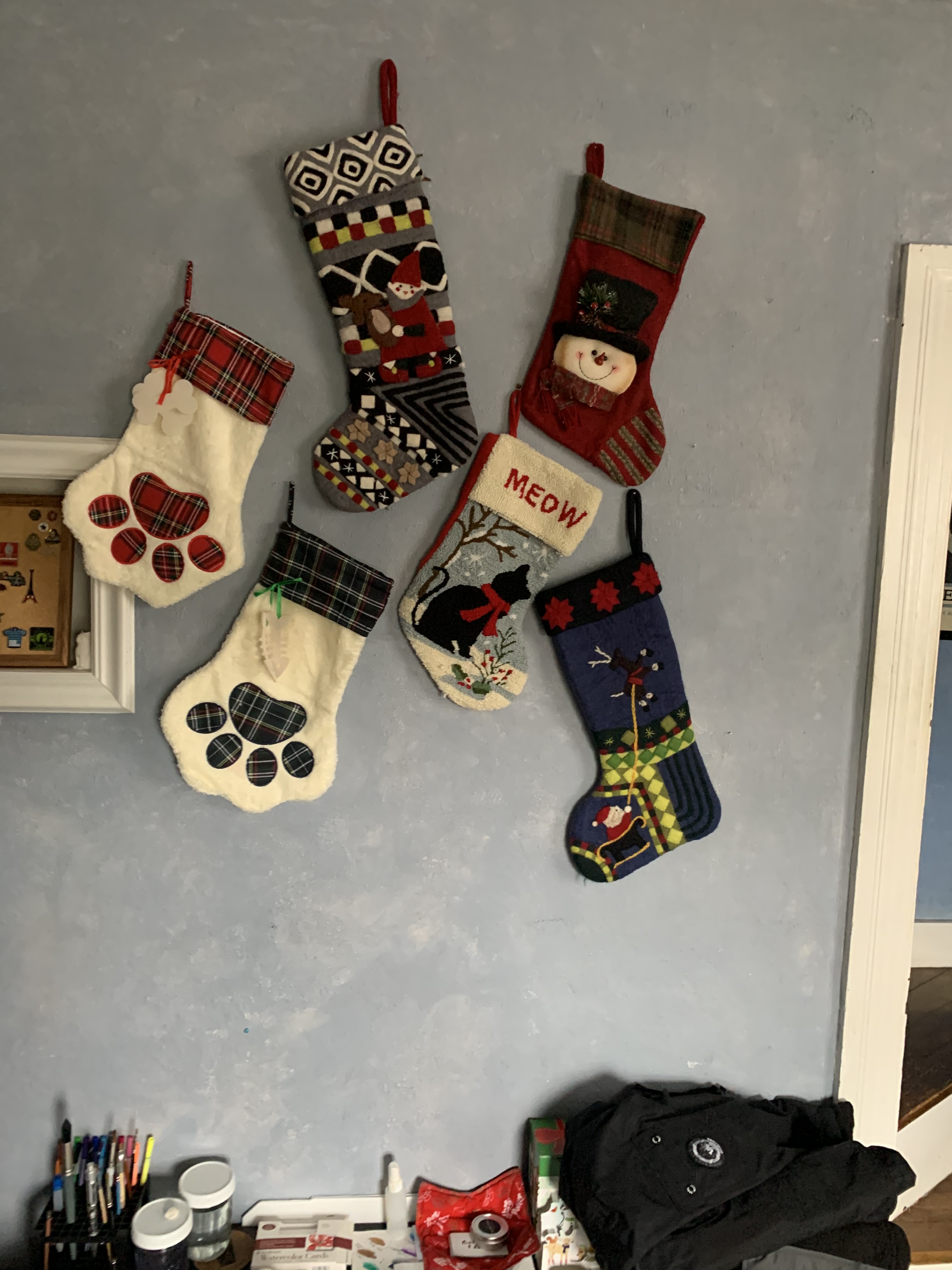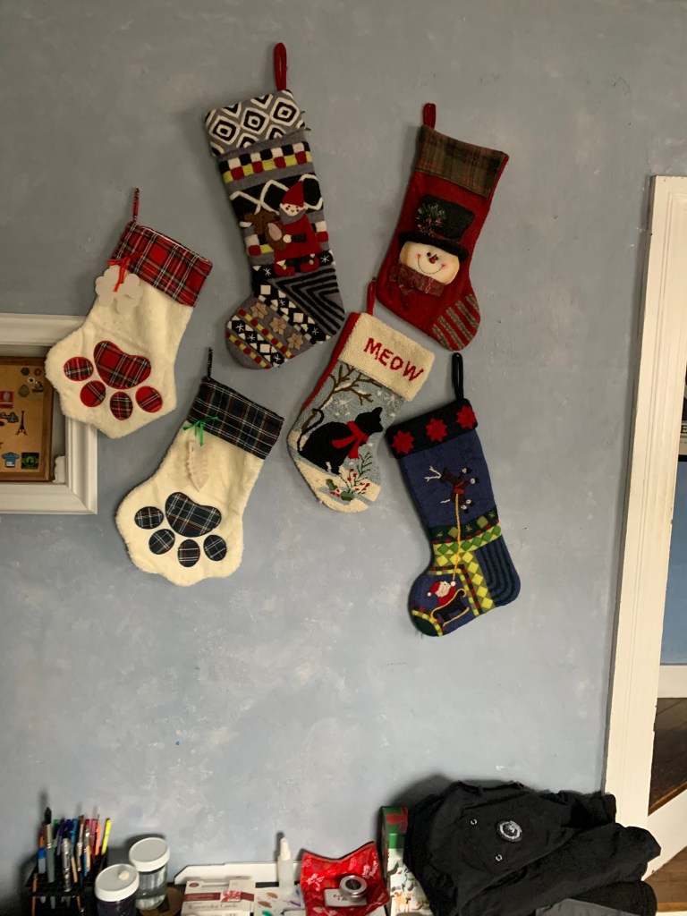 Normally the stockings are hung on the wall, as my partner doesn’t want to put in any new nails. Since they’re using existing nails—a mixture of former stocking hangers and picture hangers, they’re all clumped up like this: