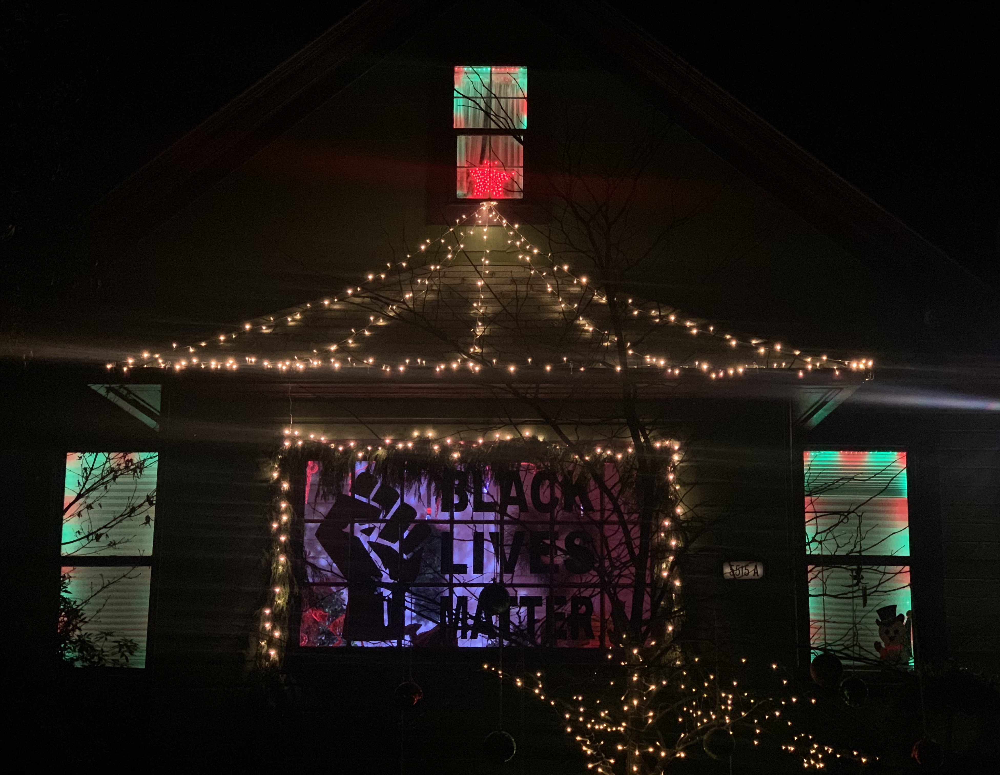 Perhaps the most time-consuming project was the lighting in the front, as a struggled with something called a telescope ladder! Still, it looks nice. Perhaps more for next year! Brian even got into the spirit by outlining the windows in green and red animated LED lights. They are synchronized to move in patterns together, because he’s a programming genius, so it’s quite the show at night!
