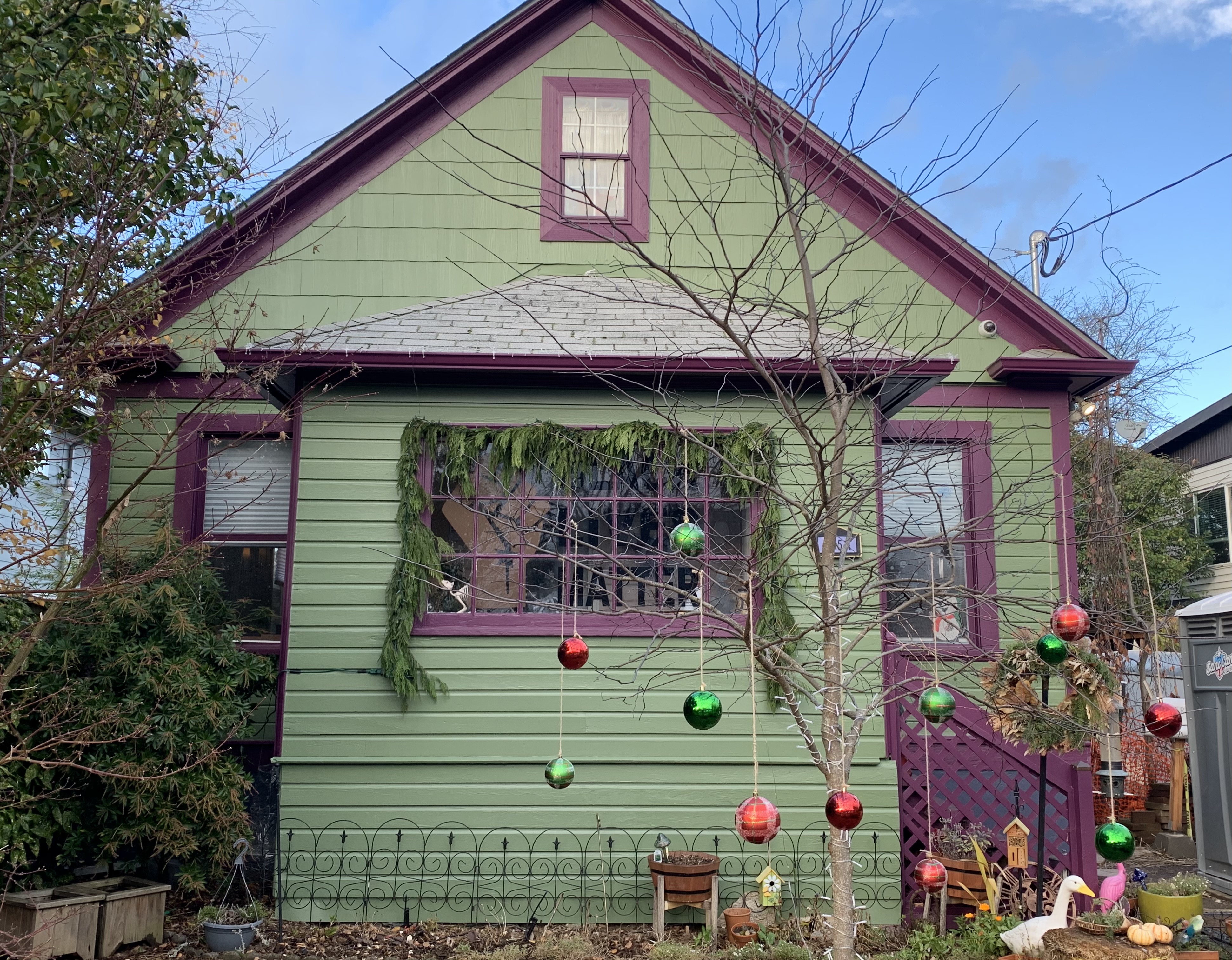 This is how it looks during the day with large ornaments on the front tree, which is lit at night as you can see in the foreground above, and a lovely cedar garland from the store.
