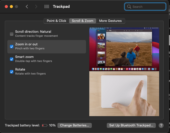 4. On the middle tab called “Scroll & Zoom,” check all of these gestures, which will make dealing with images much easier on your hand. I prefer the “unnatural” scroll direction, so try it both ways to see which feels more comfortable to you.