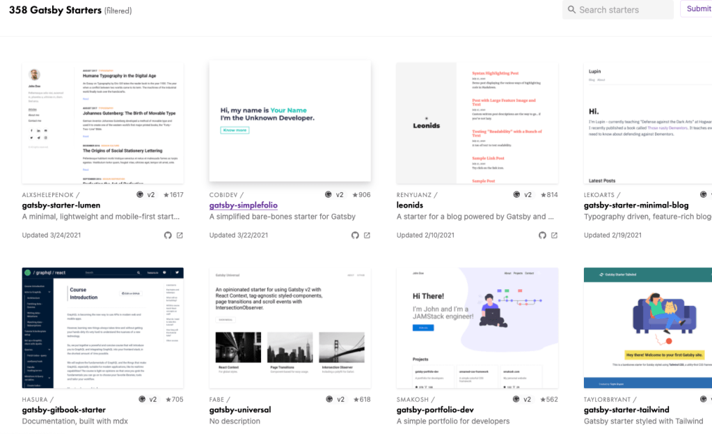 As a technical writer, I’m more focused on the content than the style anyway, so it’s wonderful to have something I don’t have to create and style from scratch. Get a head start on your static site by choosing a template from the Gatsby Starter Library. The CLI command is at the bottom of each templates’ page, but you can also directly clone it from GitHub or try it out in the CodeSandbox too! See each of these options under the template preview:
