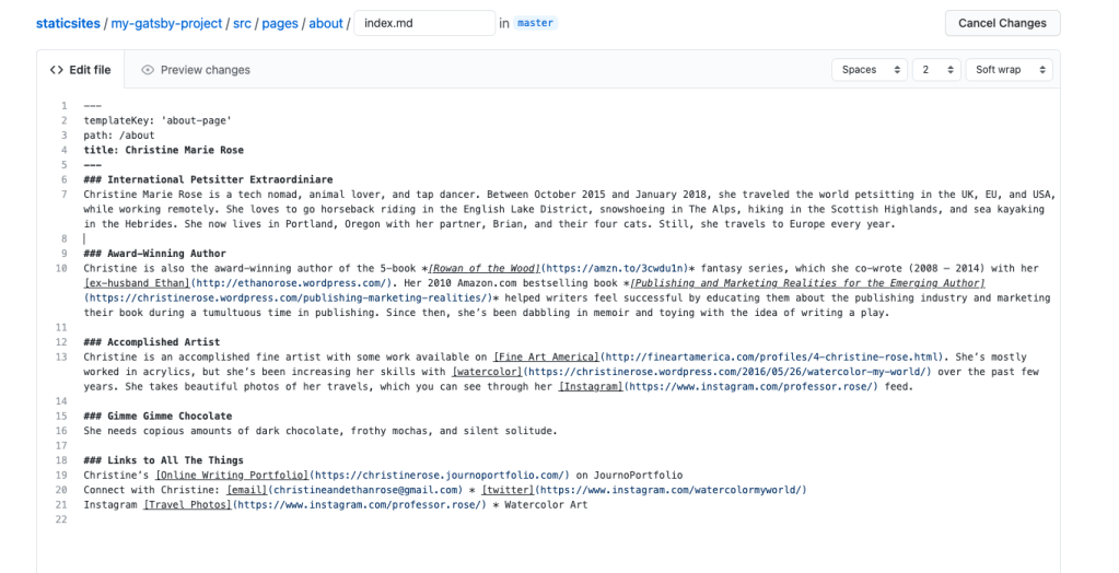 From here, you have all the files and design and everything else you need! Now you can focus just on the content! In the src/pages directory you’ll find other folders, each with it’s own Markdown file. For example: src/pages/about/index.md. Each of these index.md files can be opened and edited in a simple text editor, or (as I just gleefully discovered) directly in GitHub! What!