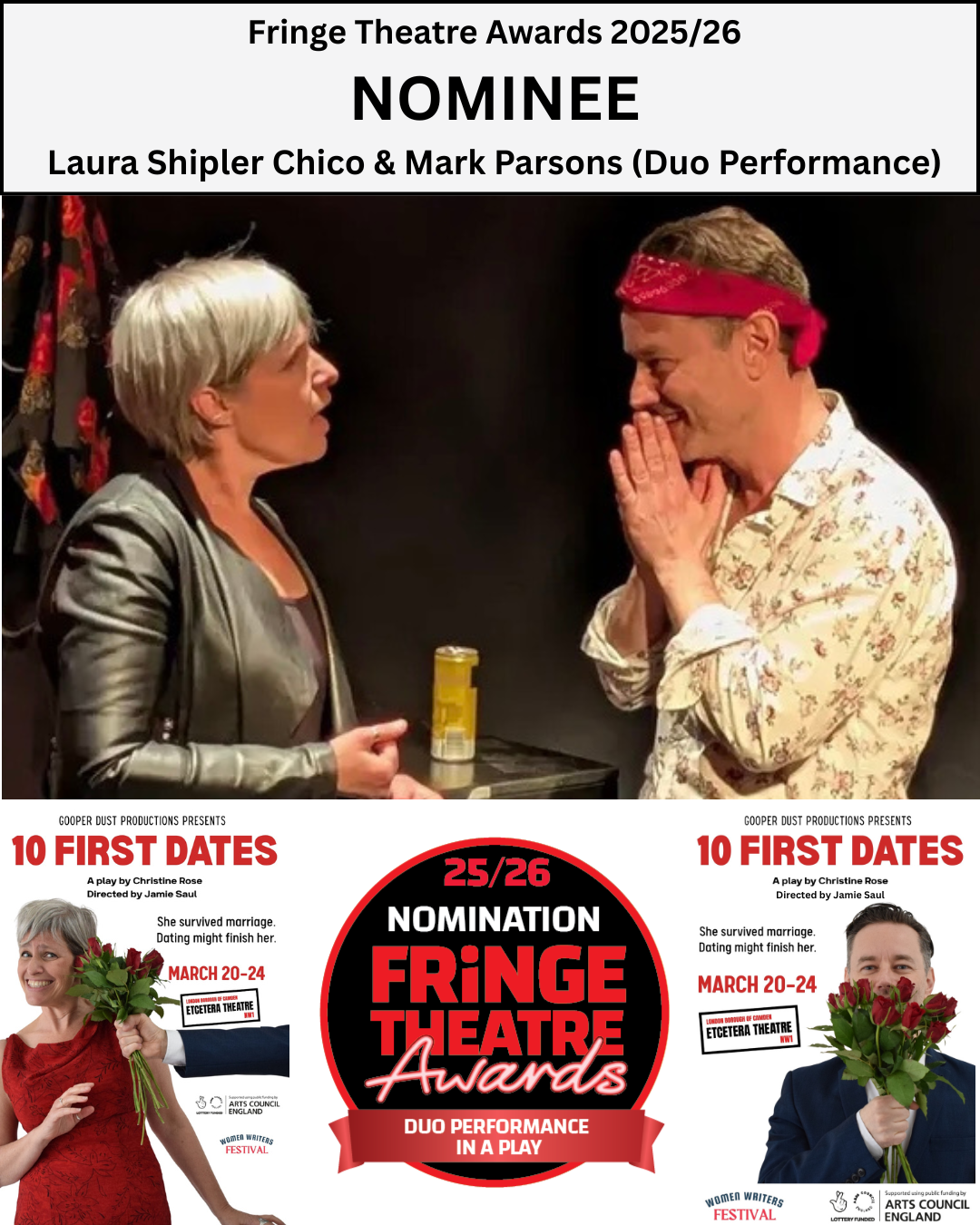 10 First Dates has been nominated for the London Pub Theatres Magazine Standing Ovation Award. Mark Parsons has received an individual nomination for his performance. Additionally, Laura and Mark have been nominated together for Best Duo Performance by the Fringe Theatre Awards.