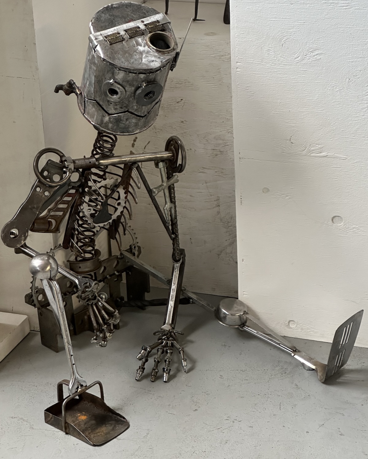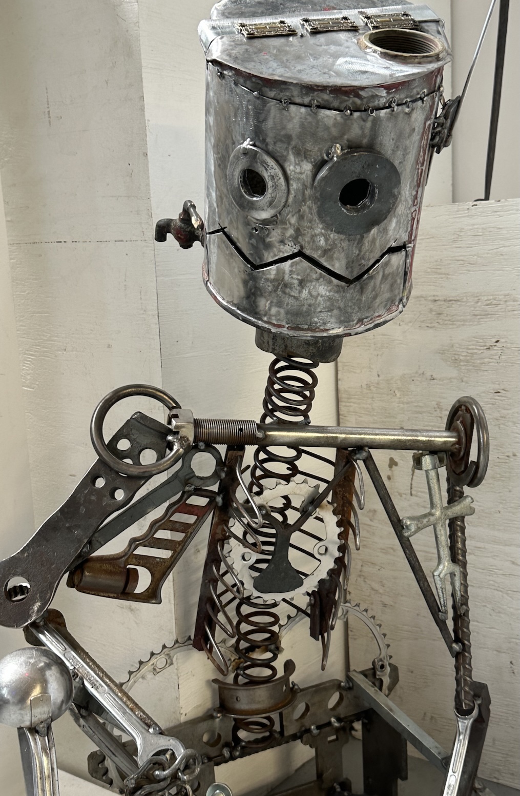 A humanoid robot built from discarded tools and machine parts, Forgotten sits waiting — lights flickering faintly within its head, like a Jack O’Lantern in the dark. Its story is one of abandonment: left behind by the one who once commanded it, still loyal, still waiting. The sculpture embodies absence, the ghost of companionship and duty unfulfilled.