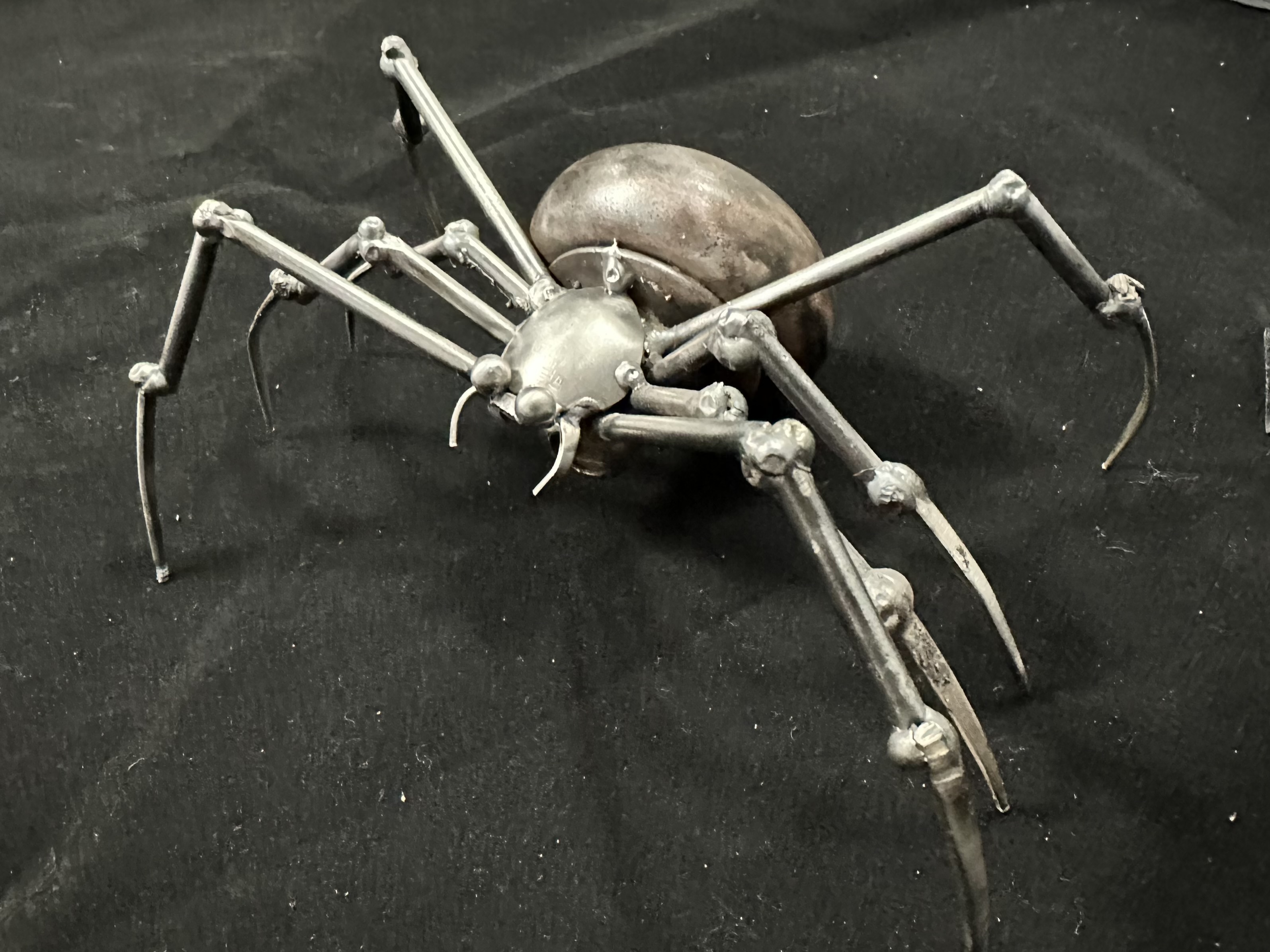 The spider is an ancient archetype — weaver of worlds, spinner of fate, both feared and revered. Iron Widow embodies this duality. Forged of salvaged steel, her form is delicate yet unyielding, a predator cloaked in grace. Across mythologies, spiders are creators: the African Anansi, the Native American Grandmother Spider, the Greek Arachne. Each weaves not only silk but the stories that bind worlds together. Iron Widow is both warning and blessing — a reminder that beauty can carry danger, and patience is its own form of power. With legs that arc like steel filigree, she seems poised between stillness and strike, embodying a truth as old as myth: that what we fear may also be what holds creation itself.