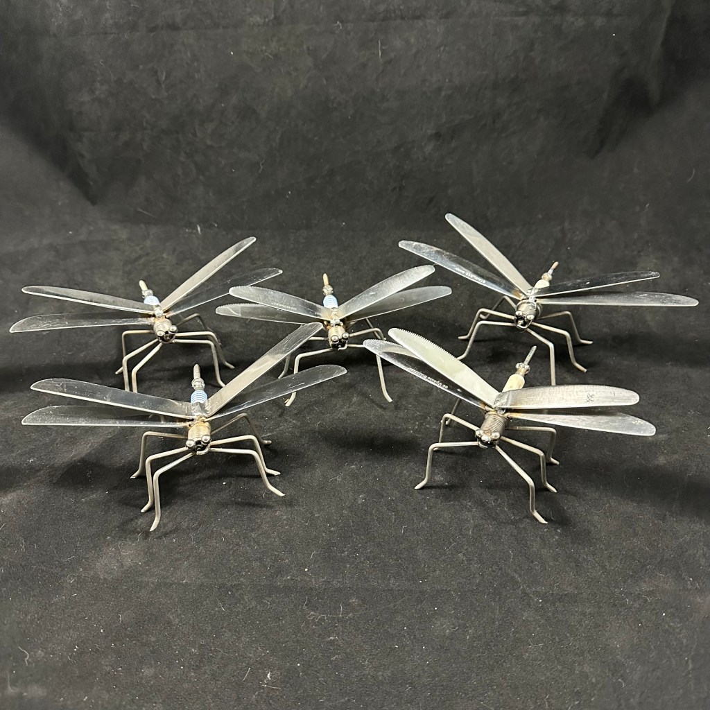Each dragonfly in this peculiar gathering is forged from reclaimed fragments of the everyday: reclaimed silverware, screws, and spark plugs, scrap that once served another life. Under heat and hammer they transform, their wings shimmering with the ghost of their former purpose. No two creatures in the Menagerie are the same; each carries its own echo, its own memory of the hands that once held the metal it’s made from.