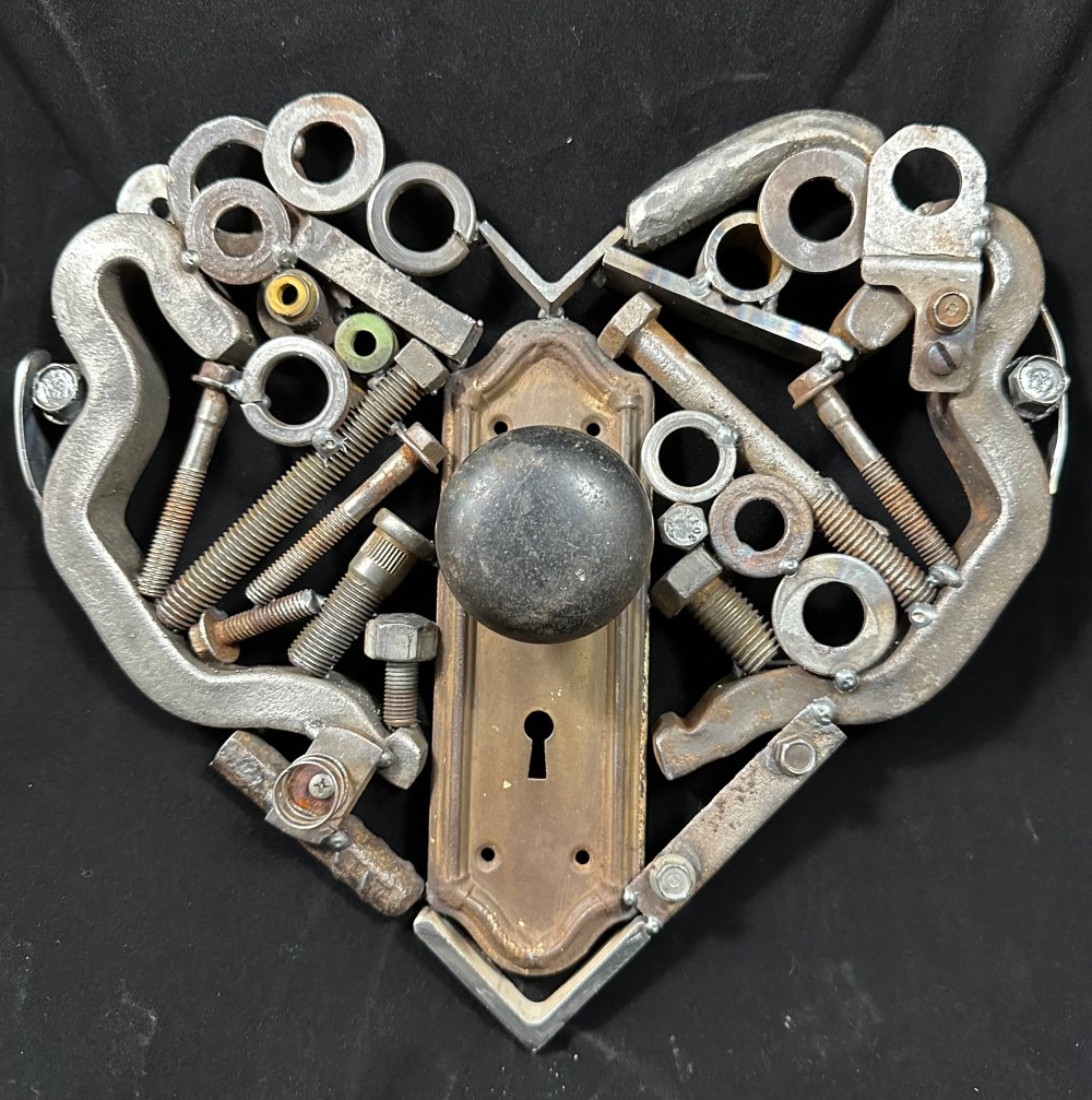 Forged of salvaged bolts and springs, Love Locked holds strength and fragility together. Its keyhole invites reflection on barriers, courage, and intimacy.