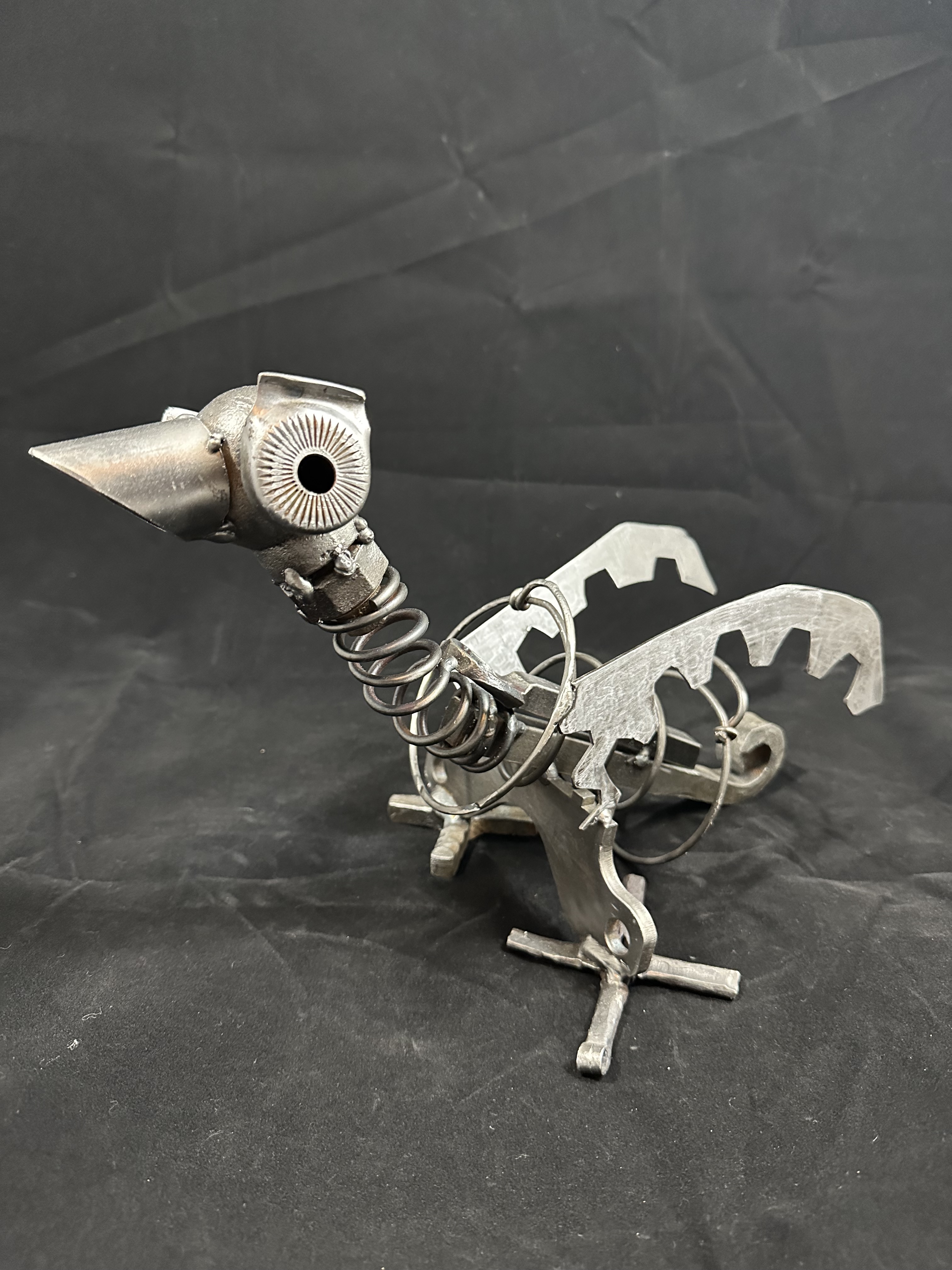 Silly Goose waddles into being from coils, spikes, and fragments of steel. Playful yet expressive, this whimsical figure carries the humor of folklore tricksters.
